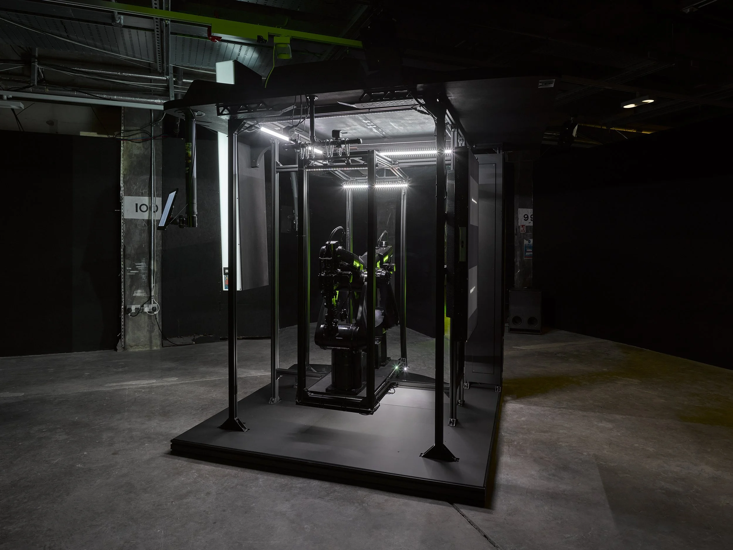 4 Channel cinematic soundscape, audiovisual sculpture, concrete, aluminium profile, polarising mirror acrylic, robotic arms, found footage, stickers.